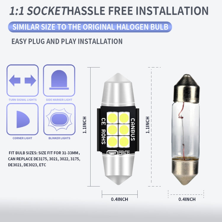 2 PCS 31mm DC12V-24V 3W 6000K 660LM 6LEDs SMD-3030 Car Reading Lamp / License Plate Light