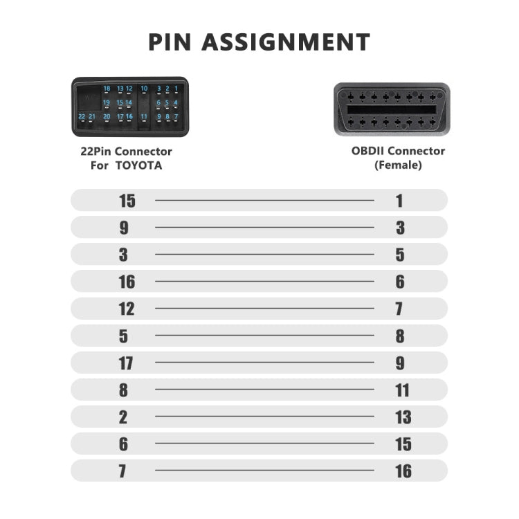 1. This is a data connection cable, used specifically for connecting your OBD2 scanner and your vehicle with this 22 pin connector which is specifically for Toyota.