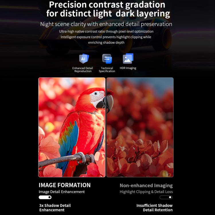 3. Accurate contrast gradient, achieve clear distinction between light and dark levels, clear night scenes, better detail retention effect, and realize ultra-high native contrast ratio through pixel-level optimization, greatly improving picture quality. Intelligent exposure control can prevent overexposure of the highlights, while enhancing shadow depth.