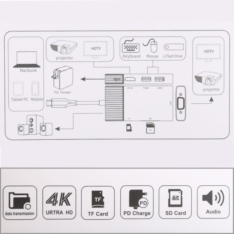 7 In 1 Dual USB 3.0 + TF/SD + HDMI/VGA + 3.5mm Jack + Type-C / USB-C Multi-function USB-C Dock Station