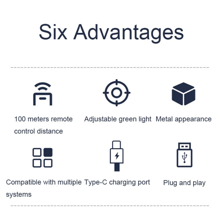 5. Function: 100 meters remote control distance, adjustable green light, metal appearance, multi-system compatibility, Type-C charging port, plug and play