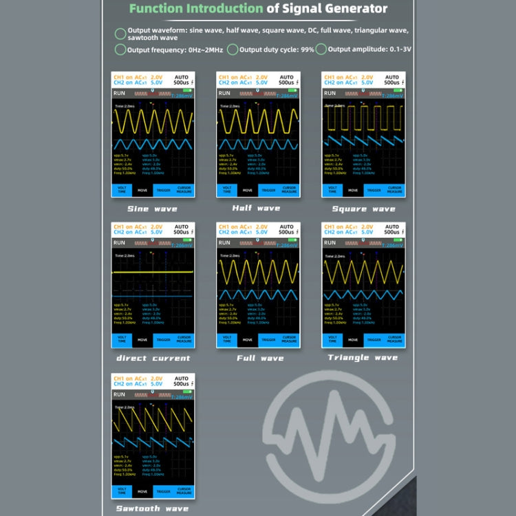 6. Waveform output type: sine wave, square wave, triangle wave, half wave, full wave, 7. sawtooth wave, DC