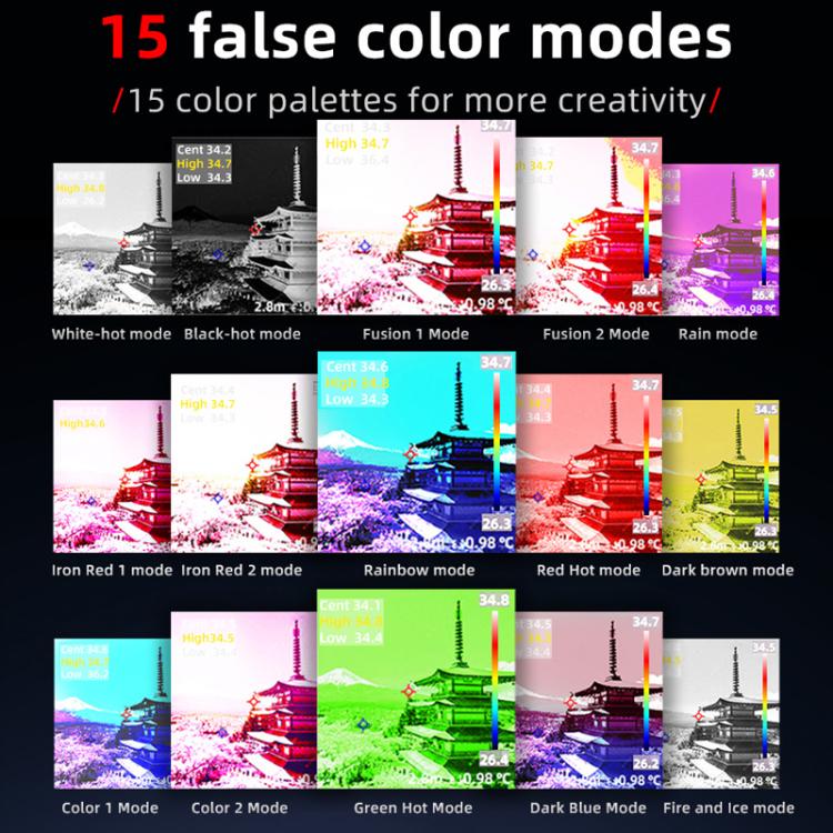2. Image color palette: black hot/iron red/white hot/fusion/sepia/red hot/green hot/rainbow