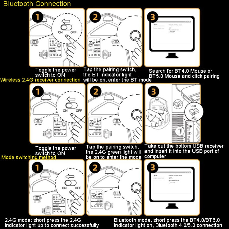 5. Connection: 2.4G wireless (USB receiver) + Bluetooth 5.0/4.0