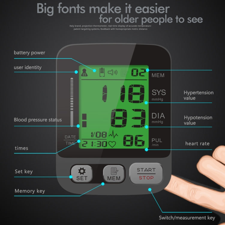 1. LCD digital display, three-color backlight, the result shows high pressure/low pressure/pulse, large screen and big characters, clear reading