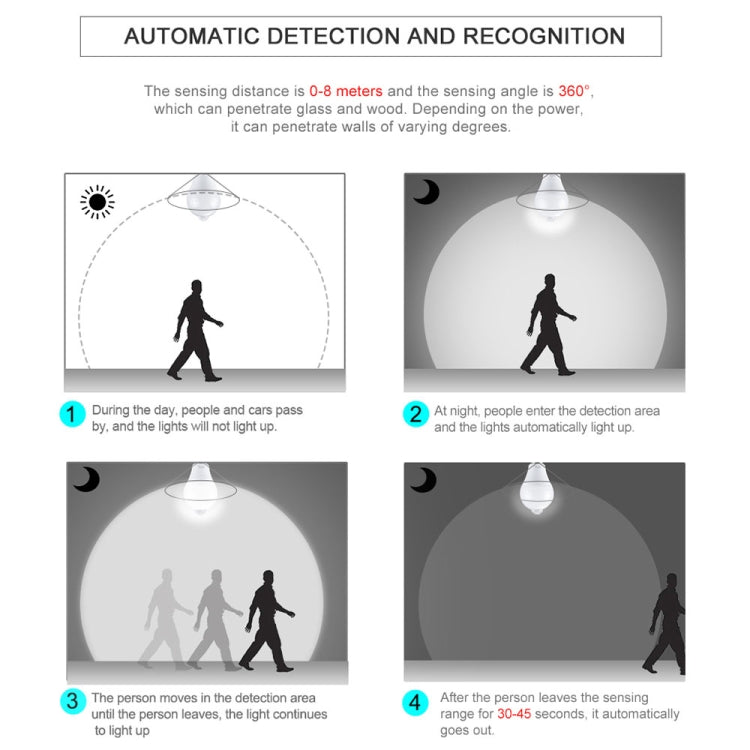 2. Auto-sensing: This bulb has built-in PIR sensor and light sensor, it will automatically turn off during the day, and automatically turn on at night when it senses movement.