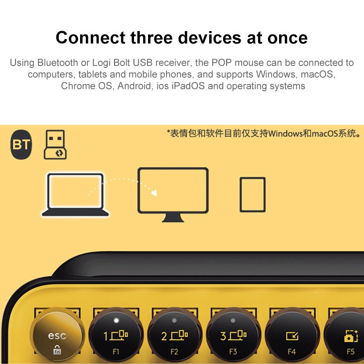 1. Three devices can be connected at a time. The Easy-Switch technology of the POP keyboard allows you to easily switch between devices. Using Bluetooth or Logi Bolt USB receiver, the POP mouse can be connected to computers, tablets and mobile phones. It supports Windows, MacOS, Chrome OS, Android, iOS operating system