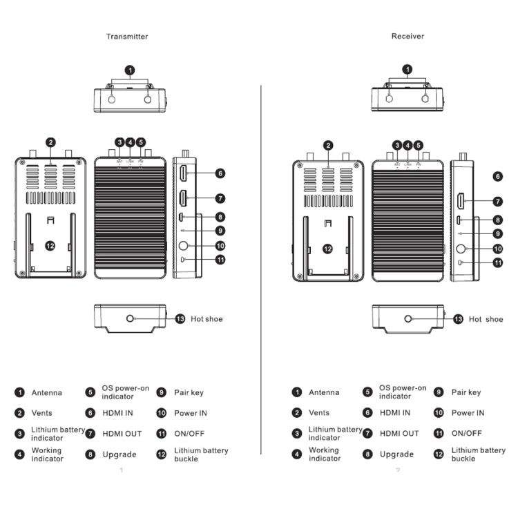 8. Interface: HDMI input*1, HDMI output*1, wireless interface (RP-SMA male)*2, pairing button*1, Micro USB interface*1, DC power input*1, power switch*1