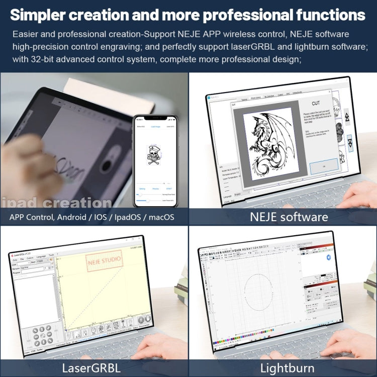 5. 32-bit control system, the fastest speed reaches 250,000mm/min, supports LaserGRBL, Lightburn, NEJE software, NEJE APP (Android, iOS, ipadOS, macOS), NEJE provides free software upgrade services.