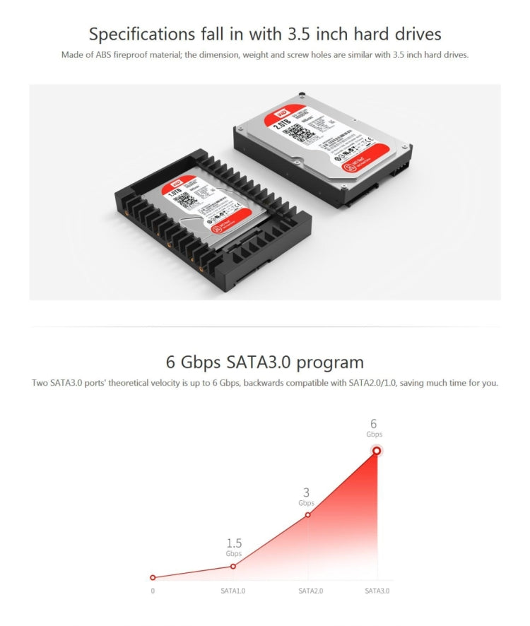 4. Specifications fall in with 3.5 inch hard drives: Made of ABS fireproof material; the dimension, weight and screw holes are similar with 3.5 inch hard drives.