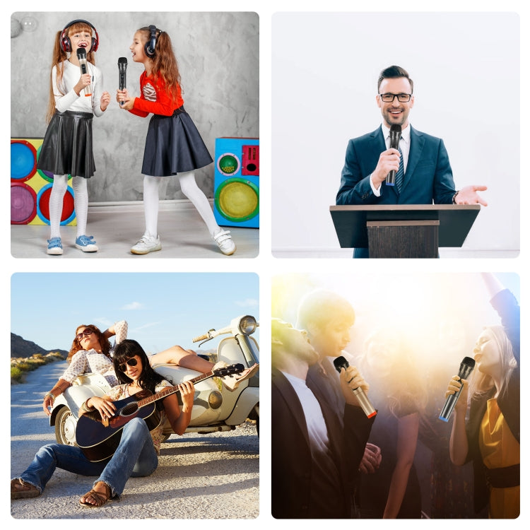 3. Plug and Play, cable-free, frequency automatic pairing, AA battery-powered handheld microphone, and 18650 lithium rechargeable battery powered receiver makes it portable (Note: The AA batteries and 18650 batteries are not included)