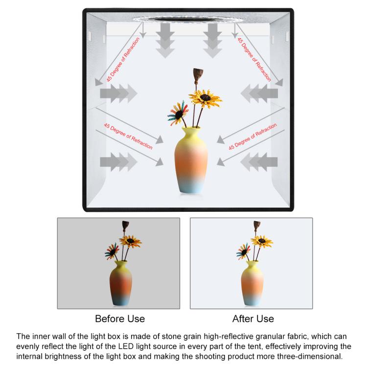 3. Easy to assemble (use it after three seconds of assembly), you can unfold this LED lightbox studio and place it on any surface to get very good backdrop for small articles business photography, taking pictures for products.