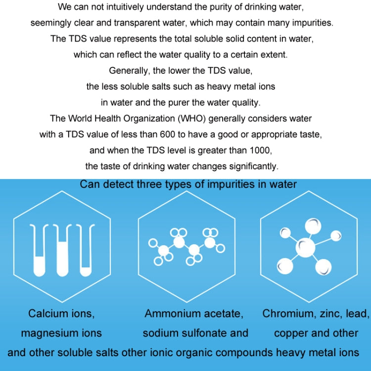 7. We cannot intuitively understand the purity of drinking water. Seemingly clear and transparent water may contain many impurities. The TDS value represents the total soluble solid content in water, which can reflect the water quality to a certain extent. Generally, the lower the TDS value, the less soluble salts such as heavy metal ions in the water, and the purer the water quality. The World Health Organization (WHO) generally believes that the taste of water with a TDS value below 600 is good or appropriate. When the TDS level is greater than 1000, the taste of drinking water will change significantly.