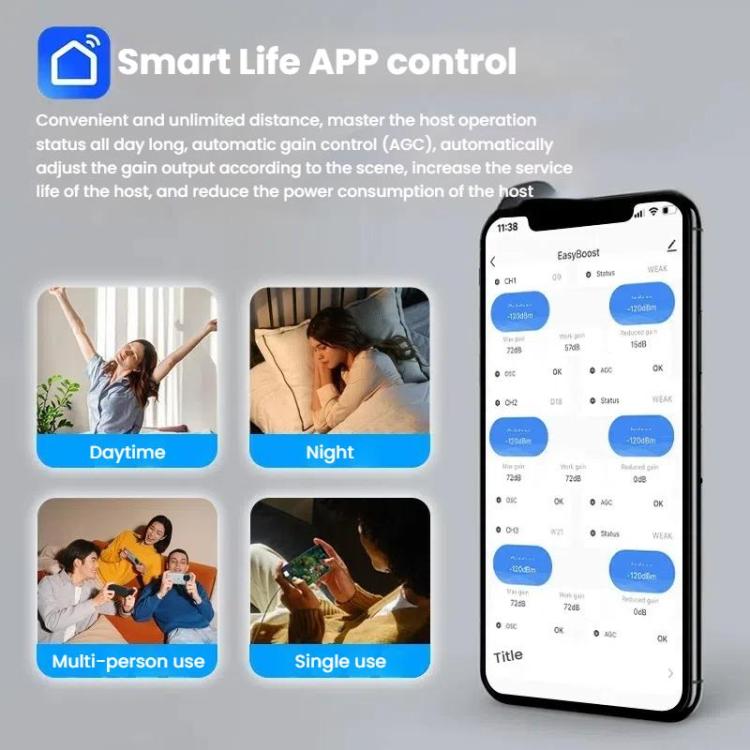2. Smart Life App Control & AGC/ALC Technology: Remotely monitor and adjust the amplifier via the Smart Life app from any location. Features Automatic Gain Control (AGC) and Automatic Level Control (ALC) to dynamically optimize signal output, extend device lifespan, and reduce power consumption.