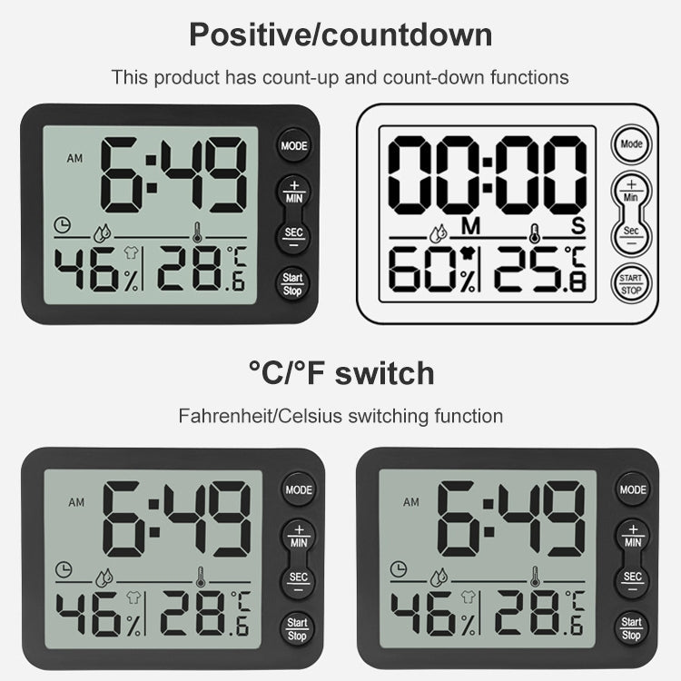 7. Function: 12/24 hours switching, counting up/counting down, humidity detection, comfort level display