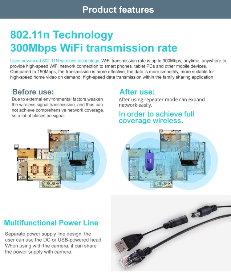 2. Support 802.11b/g/n WiFi transmission protocol, 300Mbps rate of transmission.