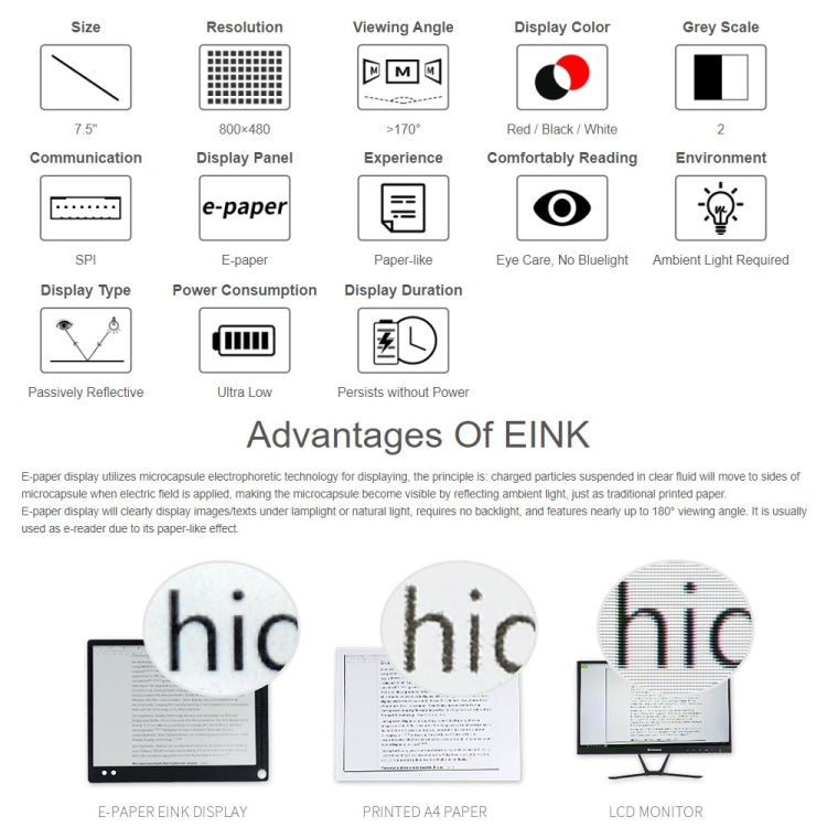 1. E-paper display utilizes microcapsule electrophoretic technology for displaying, the principle is: charged particles suspended in clear fluid will move to sides of microcapsule when electric field is applied, making the microcapsule become visible by reflecting ambient light, just as traditional printed paper.