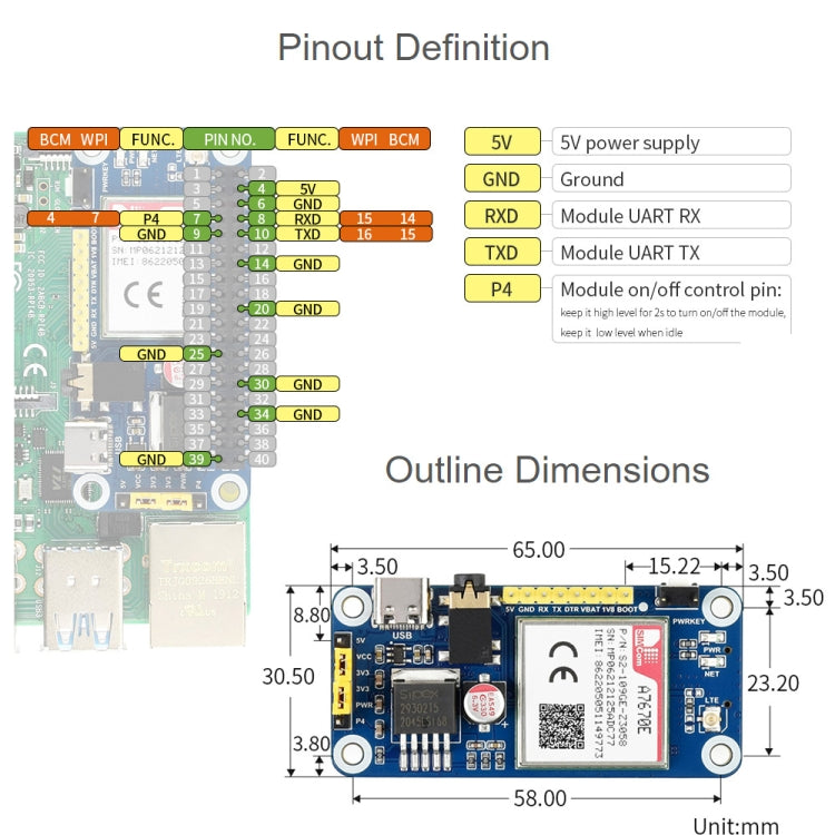 Waveshare Multi Band 2G GSM / GPRS LBS A7670E LTE Cat-1 HAT for Raspberry Pi, for Europe, Southeast Asia, West Asia, Africa, China, South Kor