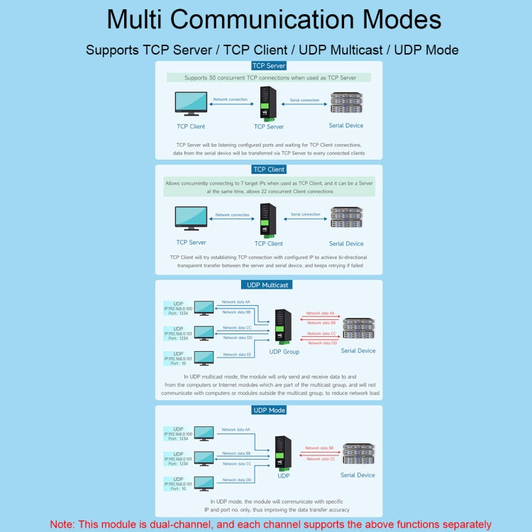 15. Working mode: TCP server, TCP client (coexisting with TCP server), UDP, UDP multicast