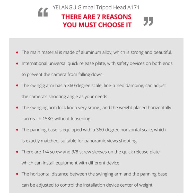 YELANGU A171 YLG0401E-C 360 Degree Rotation Horizontal Cantilever Gimbal Tripod Head for Home DV and SLR Cameras