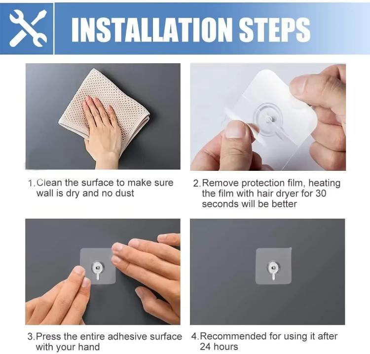 5. Easy to use, wipe the wall, tear off the protective film, stick it on the wall, exhaust the internal air, leave it for 24 hours for better adhesion, and then hang items.