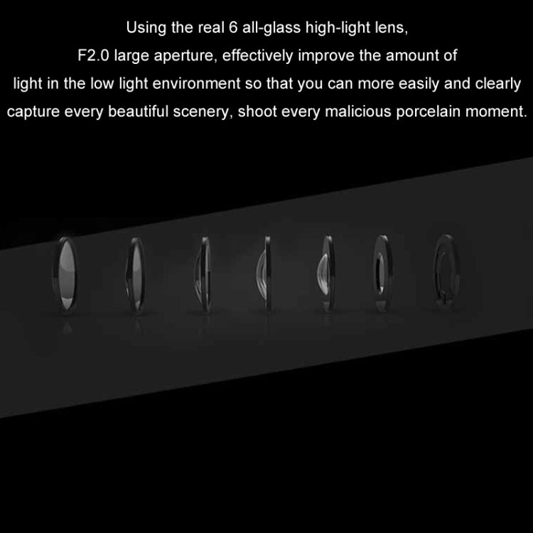 13. It adopts 6 pieces of all-glass high-transmittance lens, F2.0 large aperture, and effectively increases the amount of light entering in low-light environments, so that you can capture every beautiful scenery more easily and clearly, and shoot every malicious touch. moment