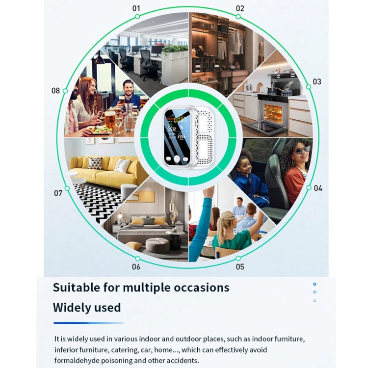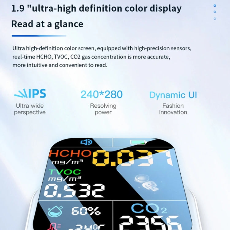 2. 1.9-inch clear color display, 240 x 280 resolution, HCHO, TVOC, CO2, temperature, and humidity are more intuitive and easy to read.