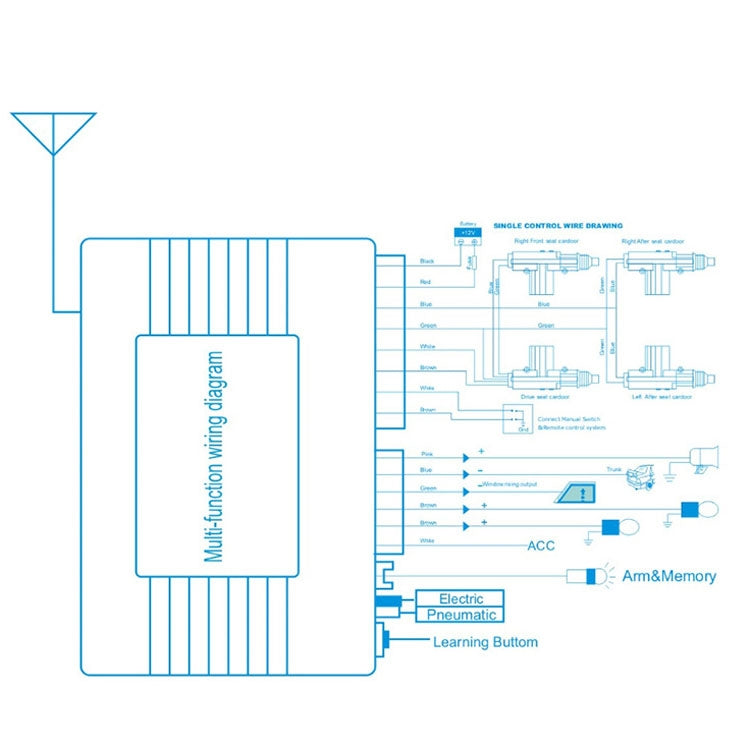1. Press the remote control lock button once, the door is locked, the direction light flashes once, the horn sounds once, the LED indicator flashes, and the window rise signal output