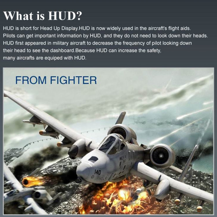 This product is for drivers' safety, at high speeds, especially in high-speed driving at night, in order to avoid the driver to look down their head to watch the instrument, and decrease car accident. HUD is in extremely critical moment reflects its delicate care. HUD can project the important information displayed by the instrument (such as speed) onto the windshield, it can not only to help determine the speed of inexperienced novice to control their speed and avoid many of the speed limit road due to speeding violation. More importantly, it enables the driver instantly read the number in great vision and always make drivers eyes on the road in clear mind.