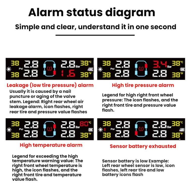 - When tire pressure exceeds the set safety range or there is a leak, the pressure value and alarm symbol for the corresponding tire on the display flash, and the buzzer emits a series of "bi.bi.bi" sounds. Pressing any key will silence the alarm, but the fault icon will remain displayed.