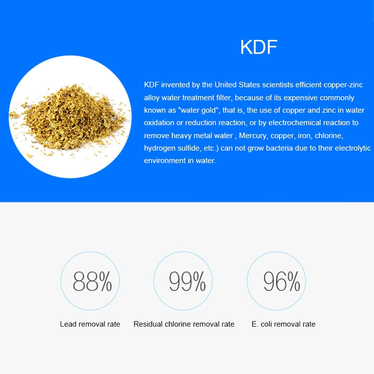 2. KDF + Calcium sulfite + Carbon + PP + Stainless steel mesh Filter, remove chlorine, heavy metal, bacteria, and etc from the water
