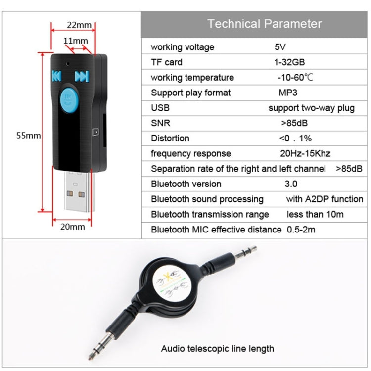 BC07 Mini Brushed Texture USB Bluetooth Receiver MP3 Player SD/TF Card Reader with Microphone & Audio Cable, Support Handsfree & AUX Output & 32GB Micro SD / TF Card & Two-sided USB Port Connecting