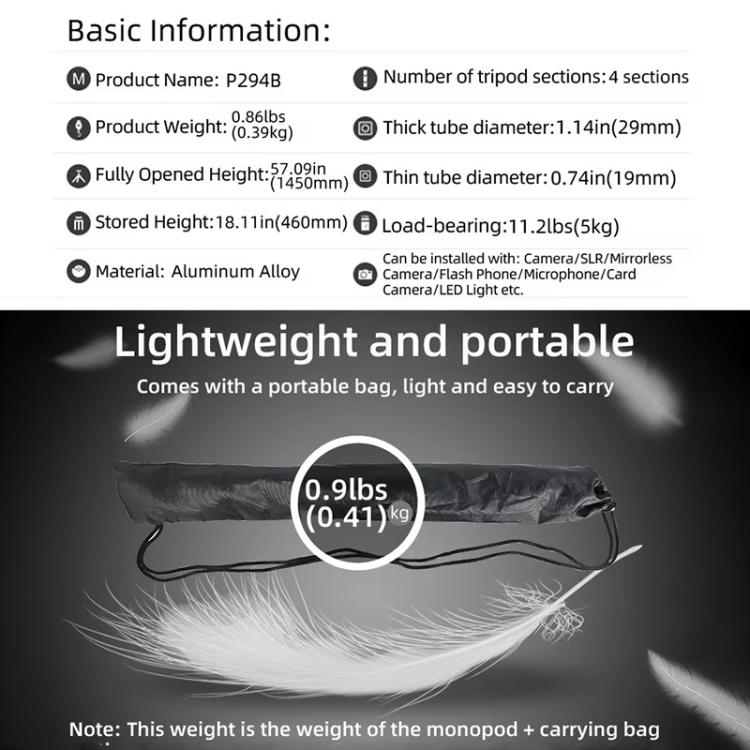 BEXIN P294B Portable Travel Outdoor DSLR Camera Aluminum Alloy Monopod Holder