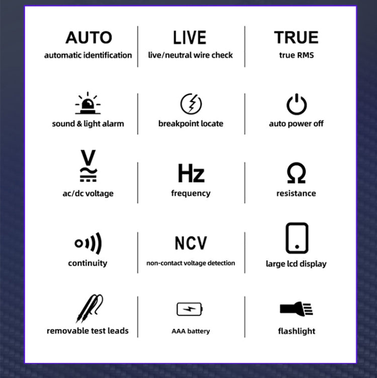 5. It has dangerous voltage induction alarm, DC/AC voltage, resistance, frequency, line/zero line difference, line breakpoint position, continuity check, flashlight characteristics, etc.