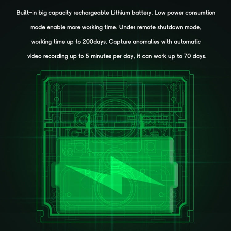 1. Ultra-low power consumption chip, fast wake-up function. When human body infrared is triggered, the camera quickly starts recording and completes video upload, and then quickly enters low-power sleep mode.