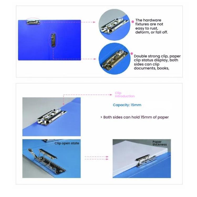 3. Elastic stainless steel hardware clip, not easy to rust, not easy to deform, and not easy to fall off. Double strong clamp, both sides can hold documents, books, and papers