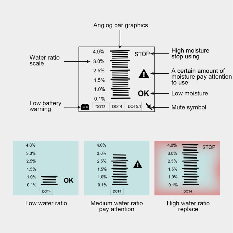 (5). Immerse the probe into brake fluid and you will get different colors of LED lights, they indicate: