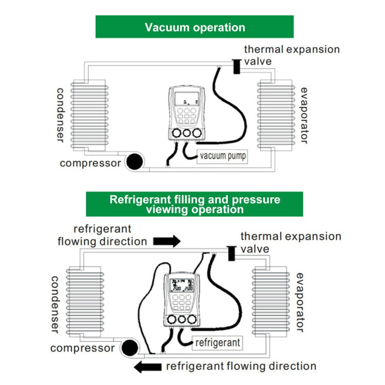 2. The instrument has double pressure test, dual temperature test (need test clip,not include), digital readout, multi-unit switching, multi-mode function and built-in refrigerant database.