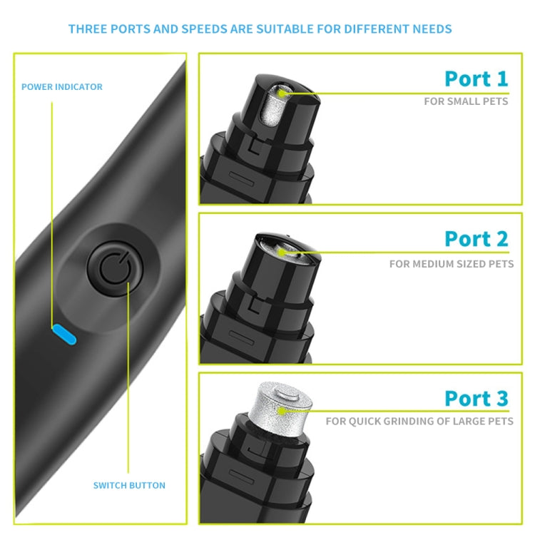 2.Equipped with a safety protective cover, you can choose the suitable port and speed according to the size of the pet. Port 1 is suitable for small pets, port 2 is suitable for medium-sized pets, port 3 is suitable for large pets, and the three ports are suitable for polishing the nails of different size pets.