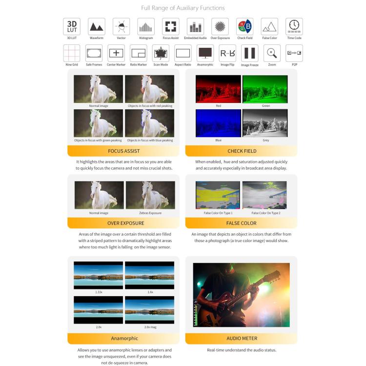 5. With Waveform, Vector scope, RGB Histogram, Focus Assist, Monochrome etc. functions, help you accurately exposure and focus every shot