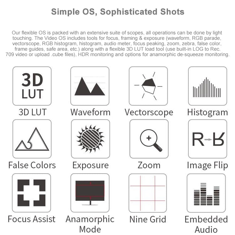1. With a complete set of tools with simple operation and professional functions, all operations can be completed with one touch. Video assistance functions include focusing, composition and exposure tools (waveform, vector diagram, RGB histogram, brightness histogram, audio column, peak focus, zoom, zebra pattern, pseudo color, safety frame, etc.) and a flexible 3D LUT loading Tools (either using the built-in LUT or uploading custom .cube files), HDR monitoring and anamorphic widescreen recovery functions