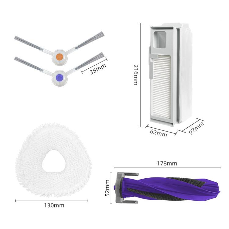 6. Size: main brush about 17.8 x 5.2cm, side brush about 3.5cm, dust bag about 21.6 x 6.2 x 9.7cm, rag about 13cm