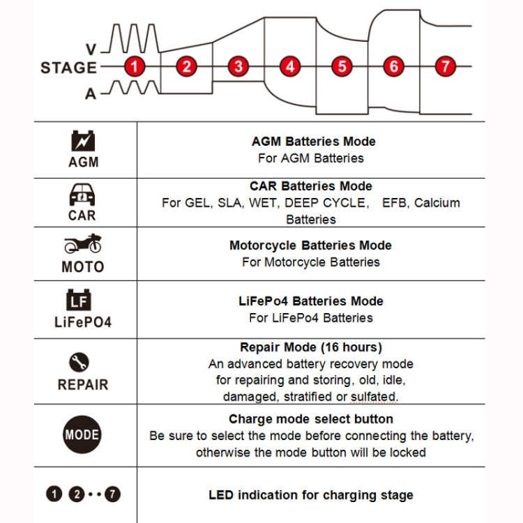 FOXSUR 12A / 12V / 24V Car / Motorcycle 7-stage Lead-acid Battery AGM Charger