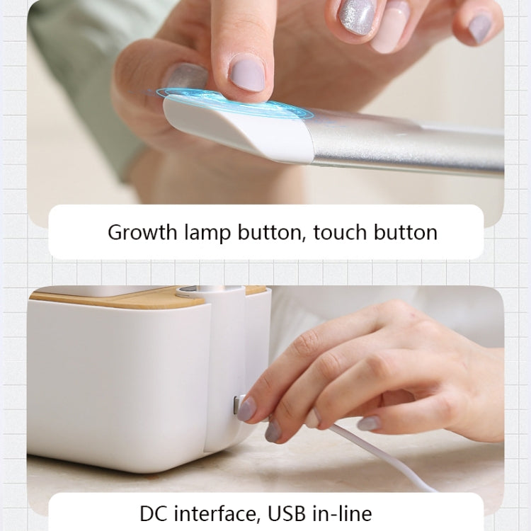 1. Click the growth light once to turn on the red light. Click it a second time to turn on the blue light. Click it a third time to turn on the red and blue lights. Click it a fourth time to turn on all the color lights. Click its 5th time to turn off all the color lights. (16 hours of work + 8 hours of sleep)