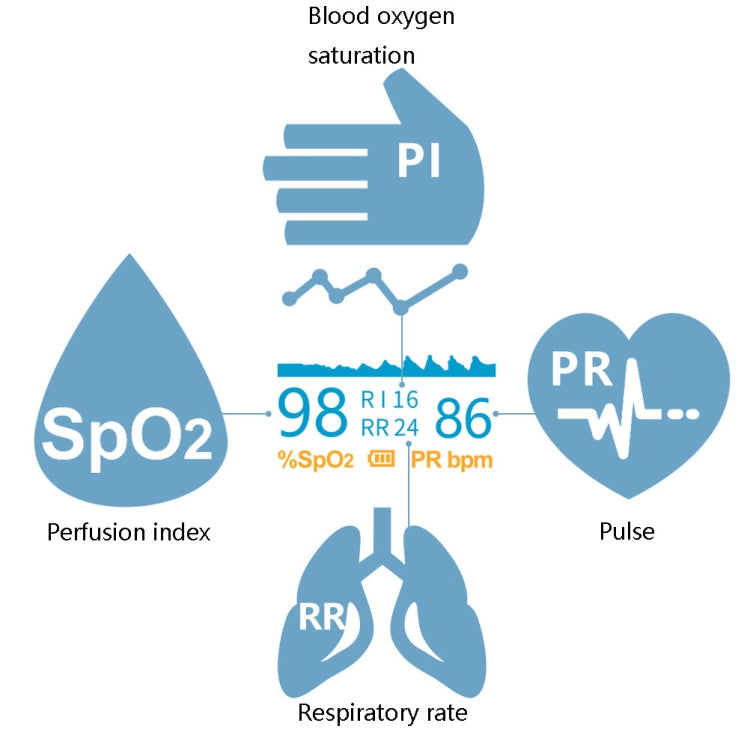2. Display parameters: blood oxygen SPO2 value, pulse PR value, blood oxygen bar graph, pulse waveform graph, PI (perfusion index), respiratory rate monitoring parameters