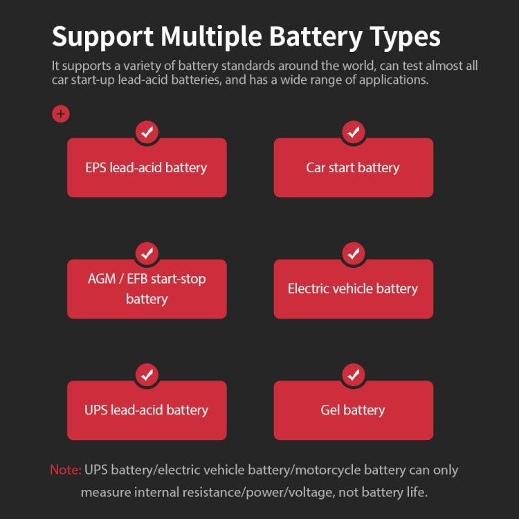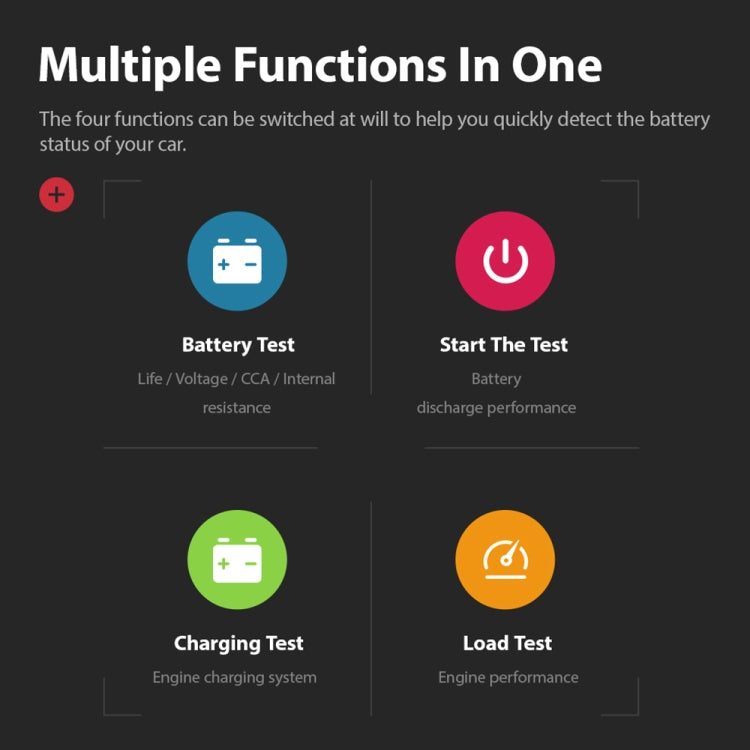 7. Four test function options: battery test (lifetime, voltage, CCA, internal resistance), startup test, charging test, load test