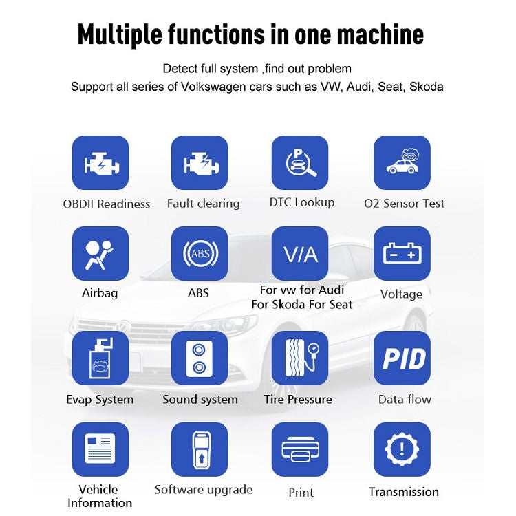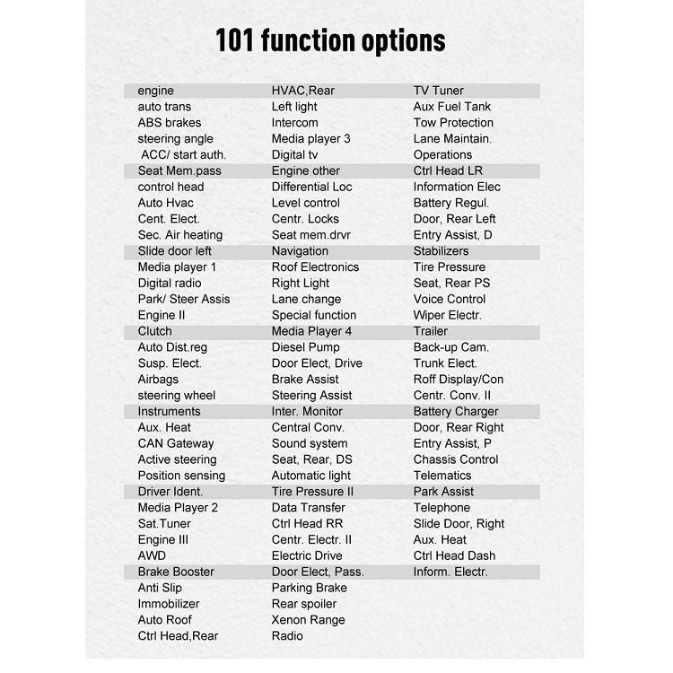 7. It is able to shut down the engine , automatictransmission , ABS Brake and SRS airbag ,transmission , warning light , engine , Oil ResetP Position Check , Brake Pad Reset , power , classisvehicles body informationair conditioner and others system . etc
