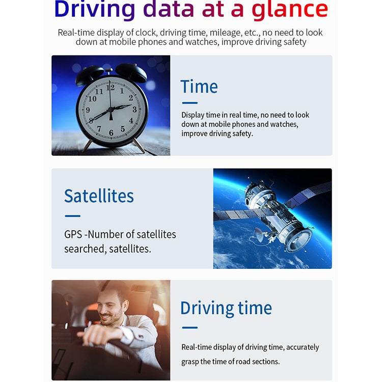 5. OBD mode Display information: driving speed, engine speed, water tank temperature, fuel consumption, battery voltage, single driving distance, single driving time, real-time time, power test, clear fault, mile switch, temperature unit switch, automatic/manual brightness adjustment