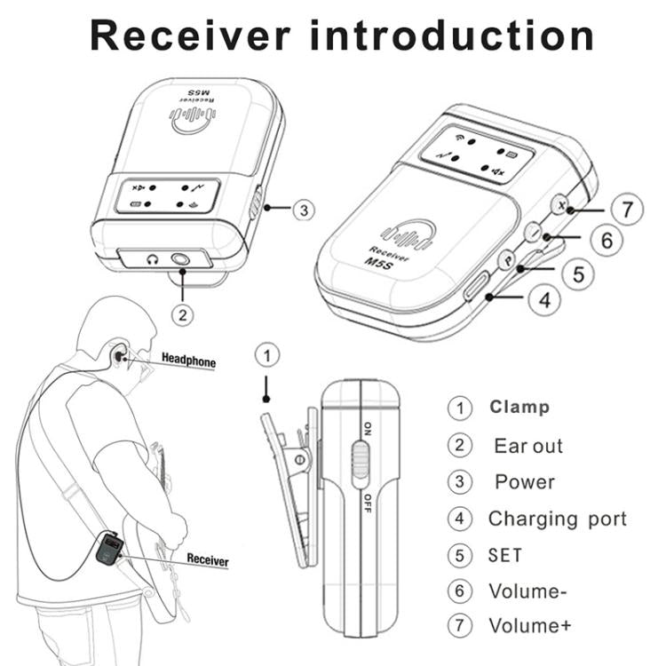 1. Adopt 2.4 GHz band chip, low noise, low latency, 24-bit/48KHz audio processor, high quality, low noise, low latency intelligent wireless headphone monitoring system. Mono/stereo input with one-button switch, compatible with any headphones.