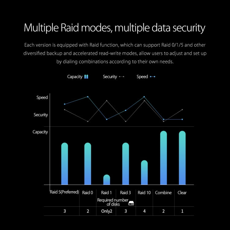 4. Array mode: RAID 0/1/3/5/10/JBOD/CLear.